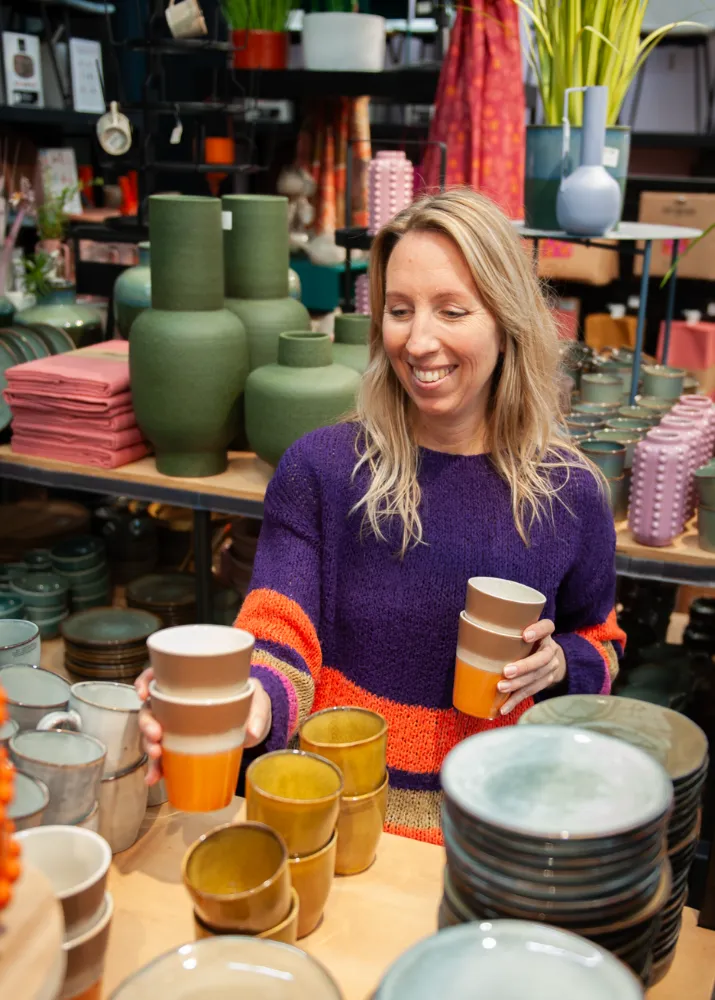 Everything for the dining table such as dinnerware, cutlery, and table linens, but also dining chairs, side tables, plant pots, and hangers. I work with the brand Mica Decorations. They have a very diverse collection with approximately 20,000 items, of which over 3,000 items carry the ‘Because We Care’ label and are thus sustainably produced. Mica Decorations always works with versatile themes, and I select my own assortment from these. Additionally, at TICA Venlo, I also offer the assortment from Wunderle. This is a German brand that works with people with disabilities and offers typical German products such as the ‘Wundertüte’.