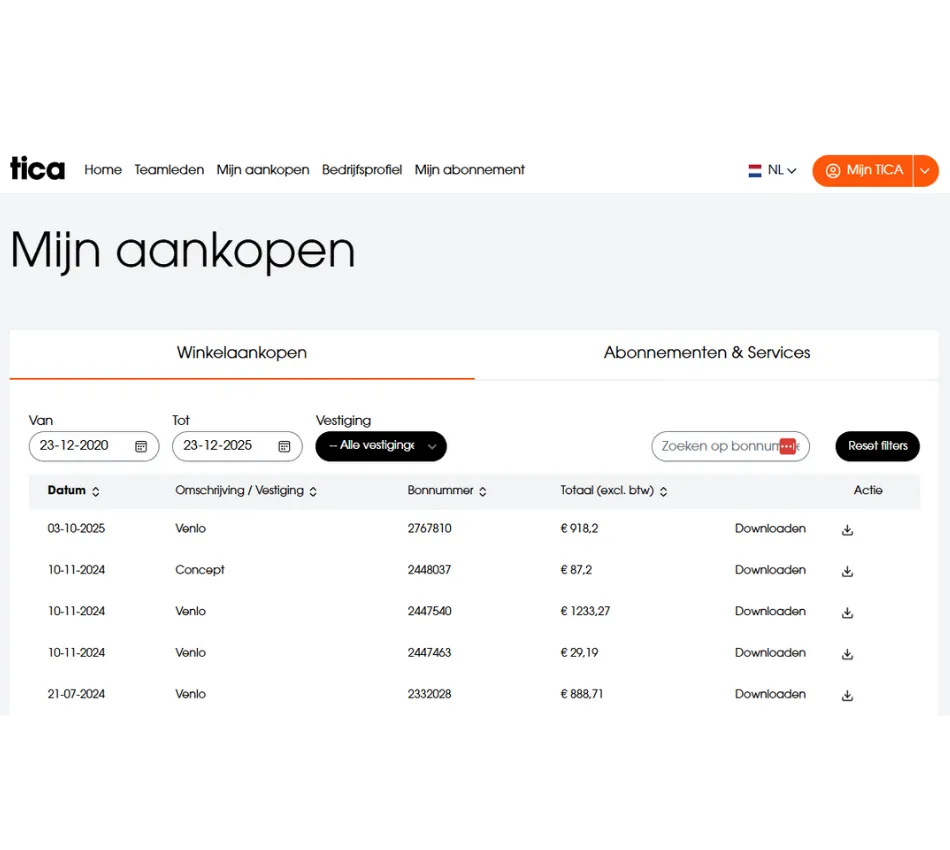 De afgelopen tijd hebben we keihard gewerkt aan een vernieuwde Mijn TICA-omgeving – en daar zijn we trots op! Alles is erop gericht om members nóg meer gemak en controle te geven. Vanaf nu regelen zij niet alleen hun digitale inkooppas en abonnement zelf, maar kunnen zij ook eenvoudig facturen inzien en downloaden. Zo hebben zij altijd grip op hun administratie en alles overzichtelijk op één plek.